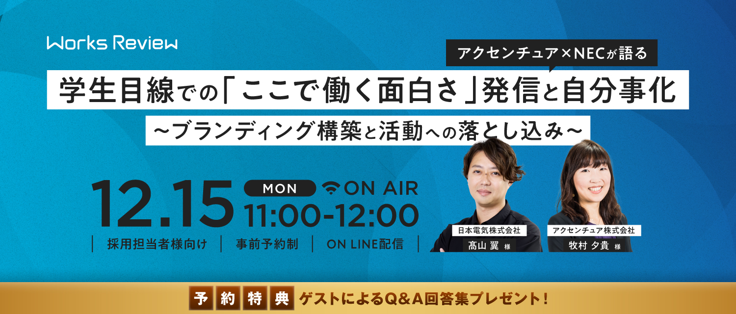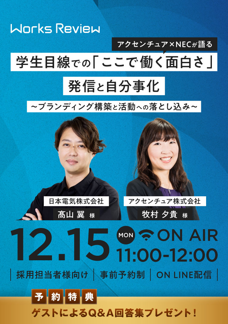 今回のWORKS REVIEWでは、学生に高い認知と共感を得るアクセンチュア株式会社と日本電気株式会社(NEC)をゲストに迎え、