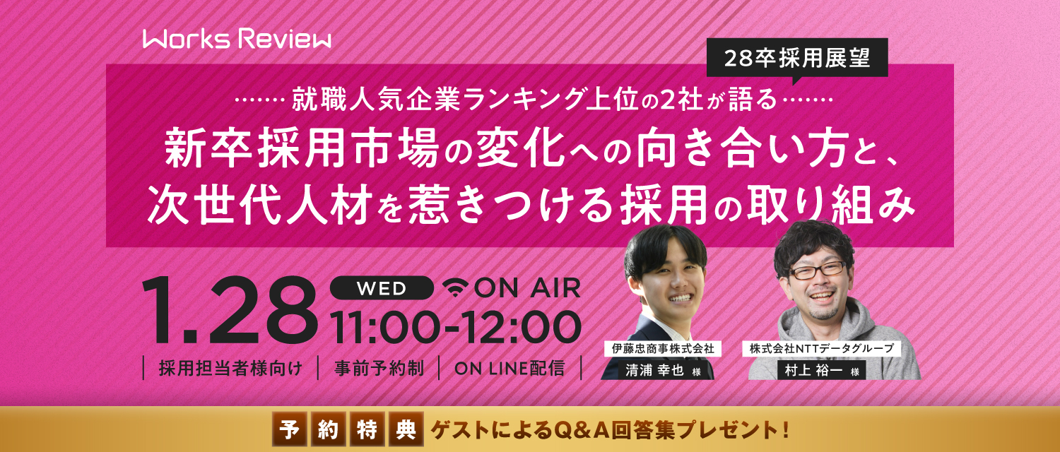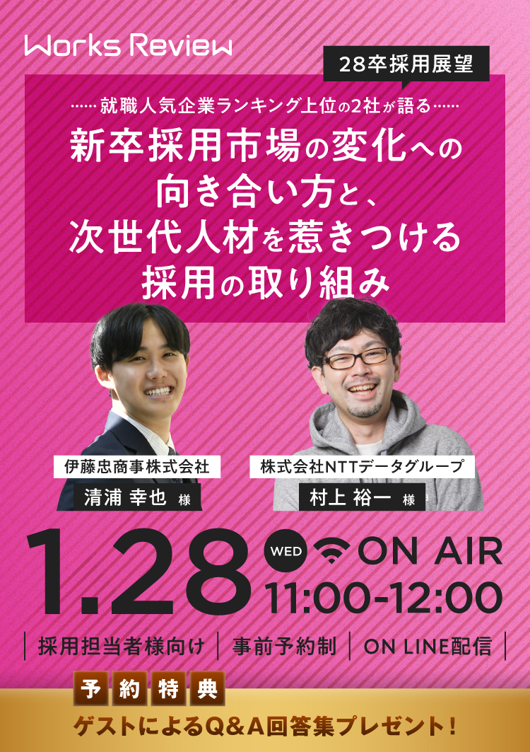 今回のWORKS REVIEWでは、産経新聞社とワークス・ジャパンが共同実施した「27卒学生が選ぶ就職人気企業ランキング」にて、上位にランクインした伊藤忠商事株式会社、株式会社NTTデータグループの2社をゲストにお迎えします。