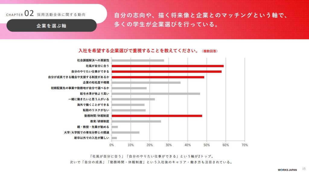 ワークス・ジャパンが実施した「27卒学生の就職活動における意識調査」によると、27卒学生が企業選びで重視するポイントは、26卒学生と比較して大きな変化はなく、「社風が自分に合うか」「成長できる環境があるか」と回答した学生の割合が最多となりました。次に「自分のやりたい仕事ができるか」が続く結果となり、「自分らしさ」「自己実現」を軸に企業を選ぶ様子が見て取れます。