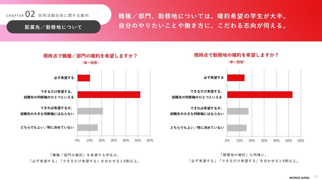 また、職種/部門や勤務地の確約希望を問う設問では、「職種/部門の確約」を希望する学生は、「必ず希望する」「できるだけ希望する」を合わせると6割以上に上り、「勤務地の確約」も同様に、「必ず希望する」「できるだけ希望する」を合わせると、6割以上を占める結果となりました。