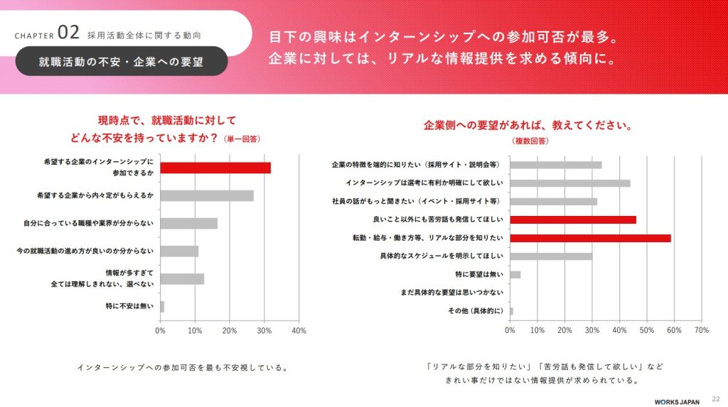 また、企業に対する要望としては、「良いところだけでなく苦労話も発信してほしい」「リアルな部分を知りたい」といった声が聞かれ、企業にリアルな情報提供を求めていることがわかりました。